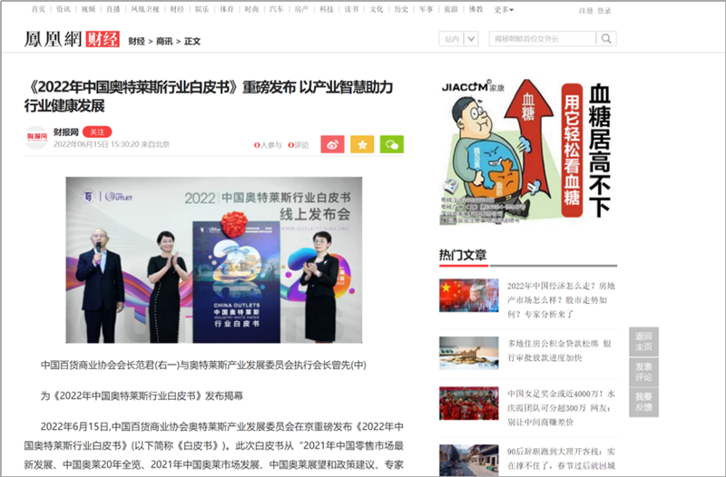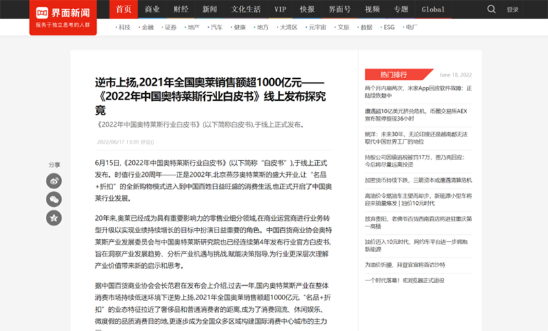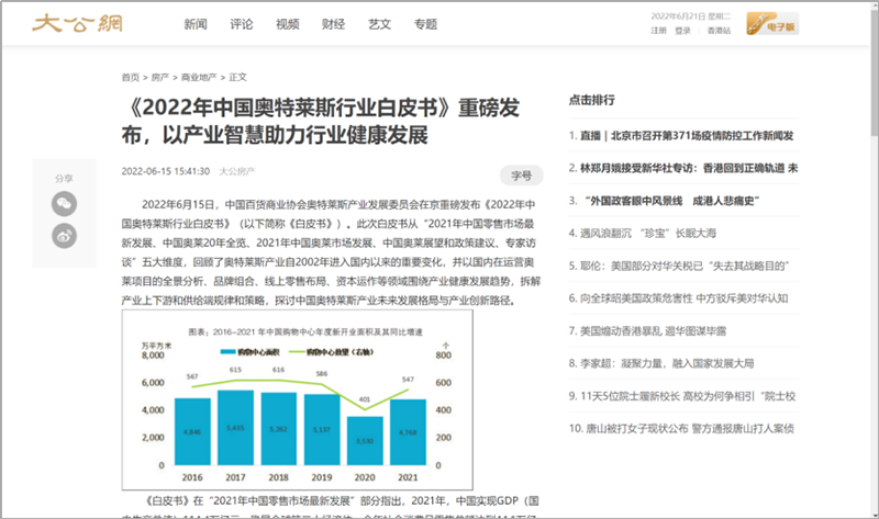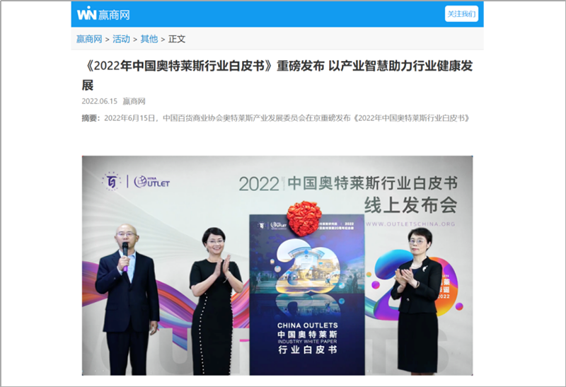 2022年6月15日,中國百貨商業(yè)協(xié)會奧特萊斯產(chǎn)業(yè)發(fā)展委員會線上直播發(fā)布《2022年中國奧特萊斯行業(yè)白皮書》。白皮書中“2021年中國零售市場最新發(fā)展、中國奧萊20年全覽、2021年中國奧萊市場發(fā)展、中國奧萊展望和政策建議、專家訪談”等內(nèi)容吸引政府領(lǐng)導(dǎo)、專業(yè)機(jī)構(gòu)、產(chǎn)業(yè)運營商、品牌商、服務(wù)商、媒體記者及眾多奧萊消費者共計20余萬人參會,成為國內(nèi)奧萊行業(yè)年度一大焦點。
