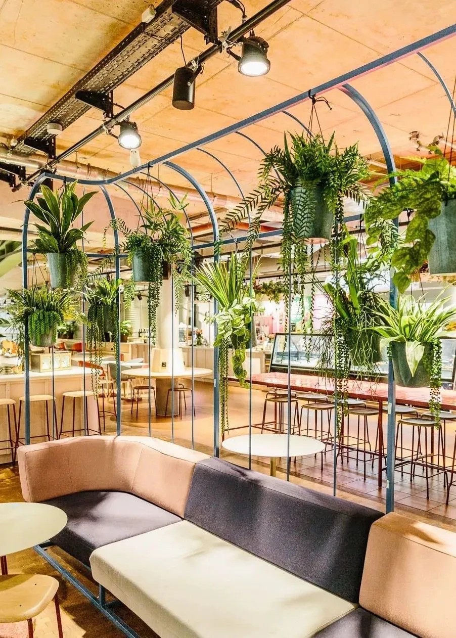 在商業(yè)的二層則設(shè)置了一個(gè)開(kāi)放、通透的公共空間,同柏林潮流酒店25小時(shí)(Twenty five hours hotel)進(jìn)行聯(lián)通。并以城市綠洲為設(shè)計(jì)概念,在頂層設(shè)計(jì)了一個(gè)布滿(mǎn)植物盆栽的七千平方公尺的天臺(tái),供給顧客休憩社交,營(yíng)造自由、無(wú)拘束的商業(yè)氛圍,與項(xiàng)目的整體定位相得益彰。