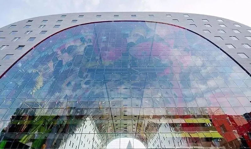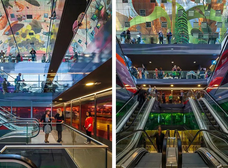建筑弧形的內(nèi)面11000㎡的彩色藝術(shù)品“豐饒之角”,是由Arno Coenen和Iris Roskam創(chuàng)作而成,將水果、魚、面包、鮮花與附近的大教堂等元素重疊交織而成。項目除兼?zhèn)鋫鹘y(tǒng)菜市場銷售食材的功能外,消費者還能在“美食市集”享受餐飲的服務(wù)和游逛的體驗,大大滿足人們的訴求。