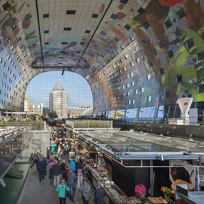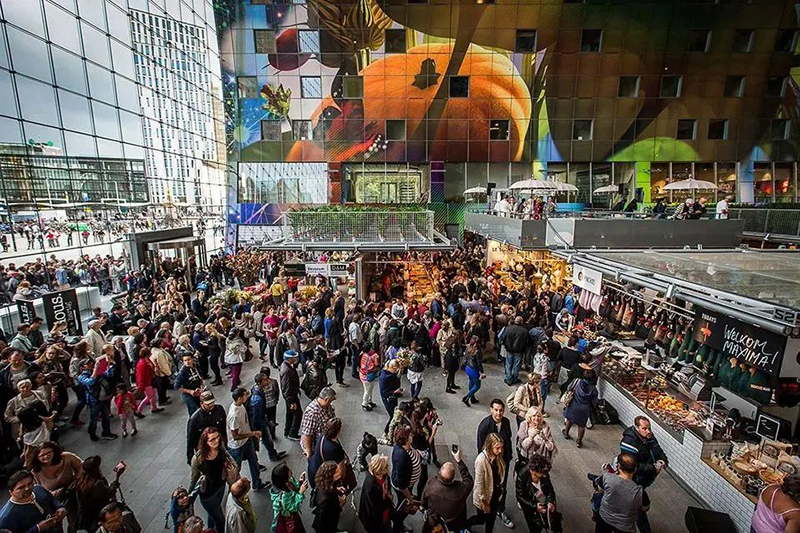 開創(chuàng)「美食市集」先河的荷蘭Markthal市場,自2014年開業(yè)以來,就受到全球各界人士的關(guān)注,年均吸引參觀游客達(dá)4.5-7百萬人次。作為荷蘭全國第一家室內(nèi)市集,以及結(jié)合居住和購物的新城市建筑類型,成功從傳統(tǒng)的菜市場轉(zhuǎn)型為具備藝術(shù)性的文藝空間、生活集市、展覽空間、創(chuàng)意工作室、綠色休閑空間以及特色居住單元空間。