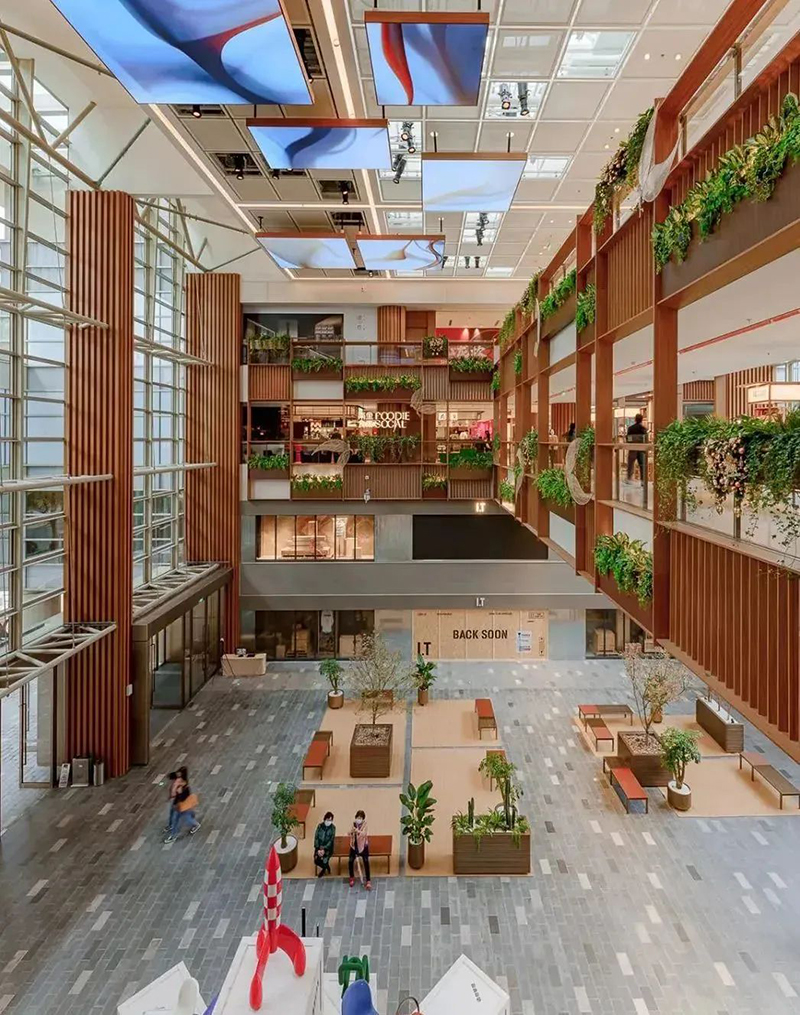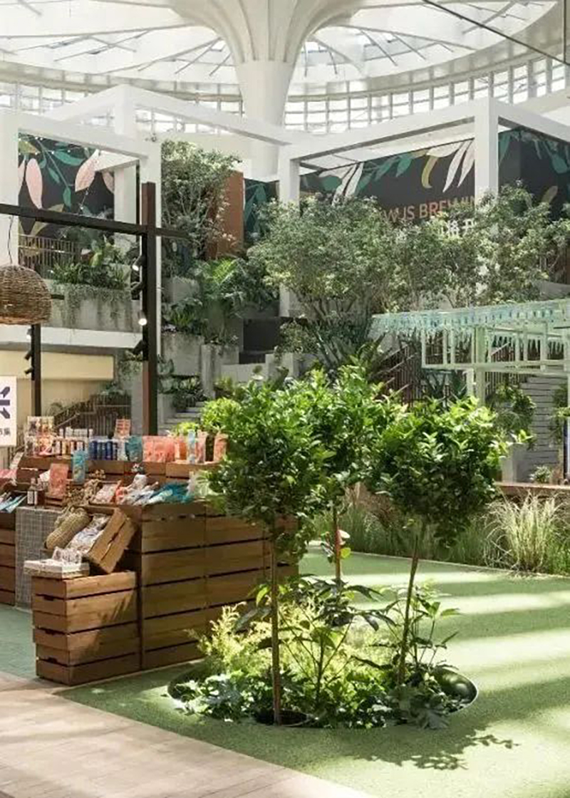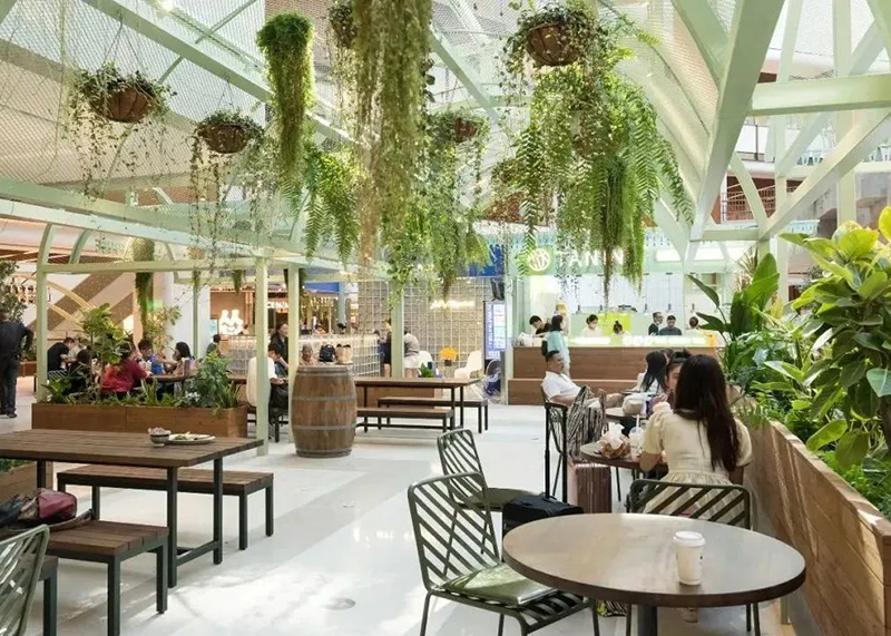 整體劃分為Foodie Market美食集市、Foodie Theatre美食劇場、Foodie Lab美食實驗室等區(qū)域。以中庭美食劇場的主題集市和舞臺為中心,創(chuàng)造田野市集,中庭兩端則分別布置棋盤廣場和陽光花房,形成多主題組團(tuán),構(gòu)成活動集聚的主體空間。還通過布滿小食或營地小車的田野食街、充滿野餐氛圍的美食街市以及高低錯落的露臺食街進(jìn)行空間串聯(lián),搭建整體市集氛圍。