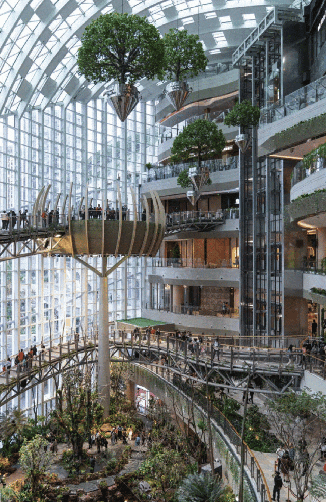 其中,「沐光森林」作為光環(huán)的標(biāo)志性景觀,以其縱跨6層、高達(dá)42米的室內(nèi)立體垂直植物園之姿,成為了眾人矚目的焦點(diǎn)。懸空其間的步行棧道,如同穿梭于綠色世界的秘徑,讓顧客在享受購物樂趣的同時,也能感受到大自然的呼吸。這條懸空跨層步道,不僅巧妙地連接了商業(yè)區(qū)域與森林景觀,更讓每一次購物之旅都充滿了探索自然與發(fā)現(xiàn)驚喜的奇妙體驗。