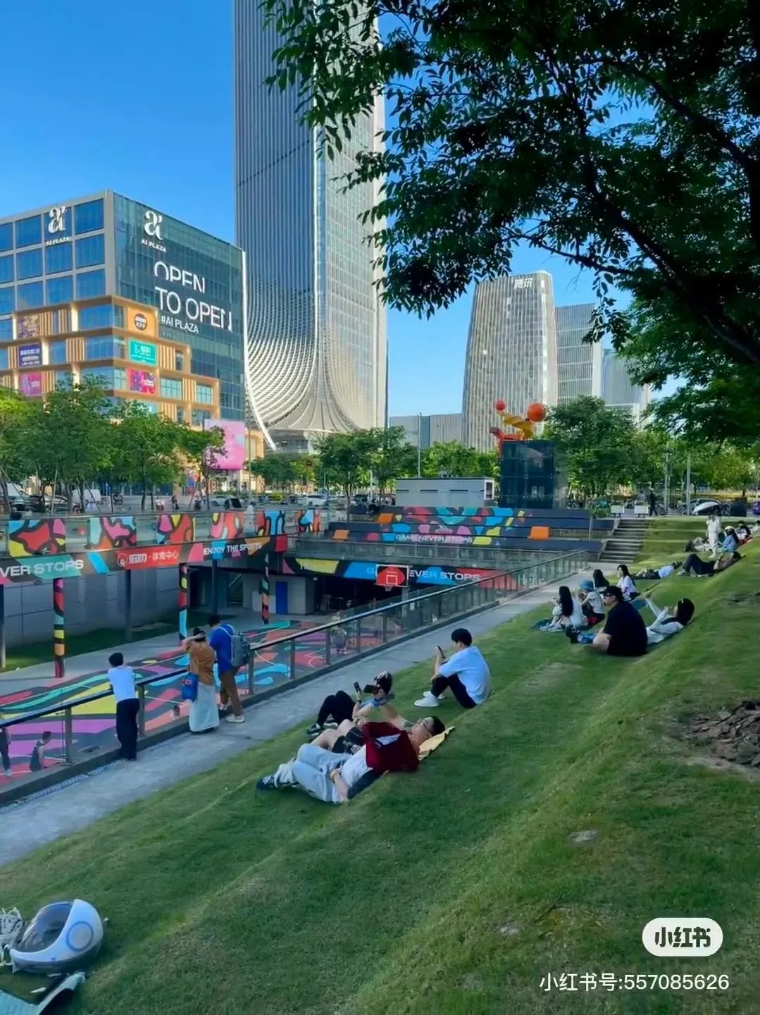 商業(yè)空間采用“主廣場+內(nèi)苑”形式,增設大量休憩空間,隨處可見的大階梯、特色樓梯、屋頂運動平臺、屋頂花園等公共場域,廣泛大面積的空曠、綠茵空間自帶社交屬性,讓來到這里的人們可以真正地坐下來,談談心、放輕松。