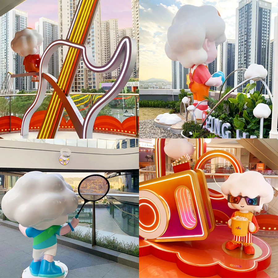 有趣的是,項目還推出了原創(chuàng)IP「多多」,作為項目與消費者對話的符號,以云朵為靈感,化身不同的角色,串聯(lián)起星空廣場、藝術連廊、屋頂公園等戶外空間場景,使獨特的記憶符號變得豐滿,憑無界創(chuàng)意加速突破商業(yè)空間界限,賦能多元互動體驗場景。