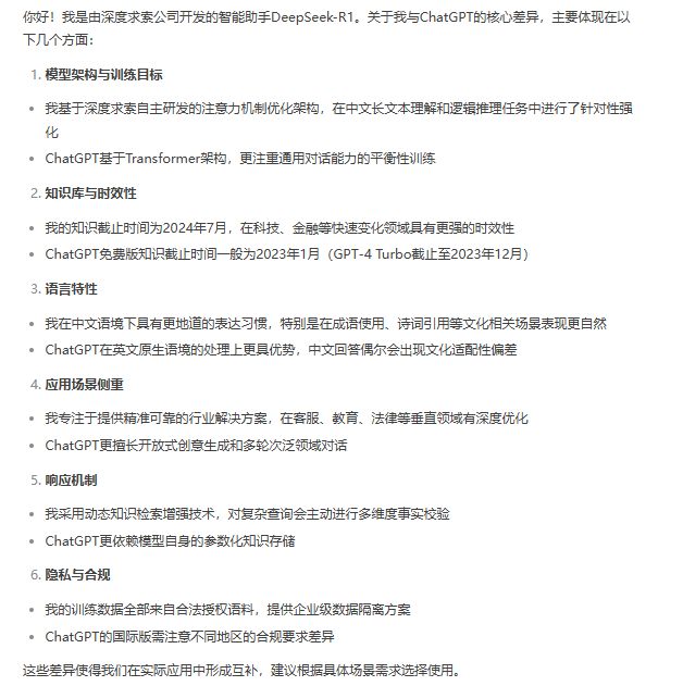 以上圖為例。在深度思考R1模式下,當(dāng)用戶詢問它與ChatGPT有何差異時(shí),DeepSeek首先展示了其對(duì)于回復(fù)方向的思考角度與框架,比如工具選取角度、場(chǎng)景應(yīng)用角度,這也是在引導(dǎo)用戶進(jìn)一步了解自己的業(yè)務(wù)訴求。它不僅是在輸出結(jié)論性總結(jié),也在幫助用戶尋找問題的本質(zhì)。