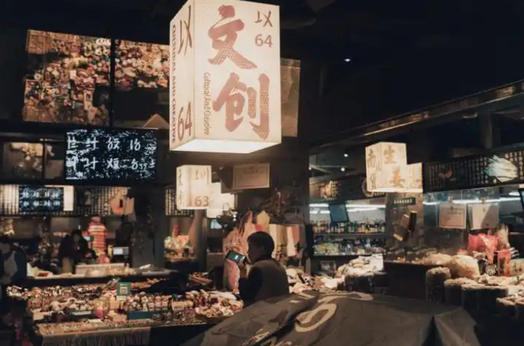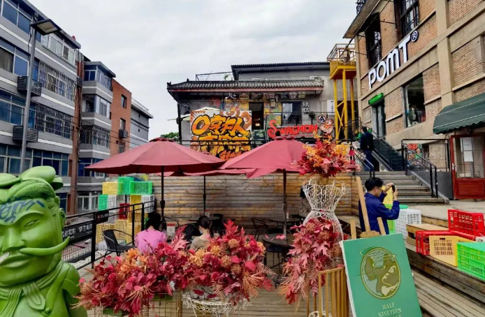 其中,信義巷子主要匯集特色小鋪,一樓布滿如陜西特產(chǎn)、小磨香油、新鮮肉鋪等門面,二樓則由咖啡館、美甲店等小店組成。每家店鋪頂部都有懸掛老菜場統(tǒng)一設(shè)計的小旗幟,既和諧統(tǒng)一又各含特色;有戲主題板塊主要以脫口秀,劇本殺,婚禮,攝影及文創(chuàng)手工等工作室等業(yè)態(tài)為主,以“有戲”為名也代表著希望,象征著新銳市井文化的希望;悅夜板塊,主要匯集酒吧、民宿等多種休閑元素。尋味板塊,則提供少燒烤、韓料、特色小吃等餐飲。