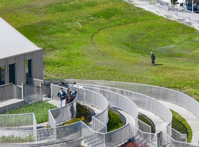 在建設(shè)空間設(shè)計上,項目將市場與公共綠地完美融合,摒棄了傳統(tǒng)菜市場簡單金屬棚的形式,屋頂打造為被草地和花田覆蓋的公園。建筑呈現(xiàn)為一個簡單的開放式結(jié)構(gòu),起伏的綠色屋頂猶如延綿的山丘,屋頂?shù)臇|側(cè)角落是一塊種植著繽紛植物和花卉的階梯狀區(qū)域,屋頂從該側(cè)向下延伸至地面,使游客可以輕松到達(dá)建筑頂端。在建筑的側(cè)面,一個簡單的四層結(jié)構(gòu)容納了市場的行政辦公室和展覽中心,后者可用于展示當(dāng)?shù)氐霓r(nóng)業(yè)產(chǎn)品。